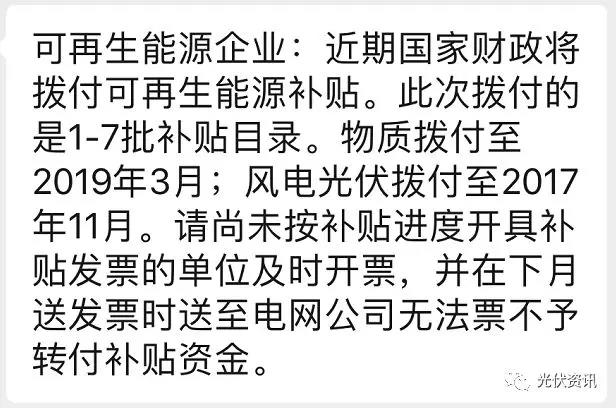 國家電網有限公司所屬東北某省級電網公司在10月底發布內部通知,要求企業開具補貼發票,通知如下:可再生能源企業:近期國家財政將撥付可再生能源補貼。此次撥付的是1-7批補貼目錄。生物質撥付至2019年3月;風電光伏撥付至2017年11月。請尚未按補貼進度開具補貼發票的單位及時開票,并在下月(十一月)送發票時送至電網公司無法票不予轉付補貼資金。