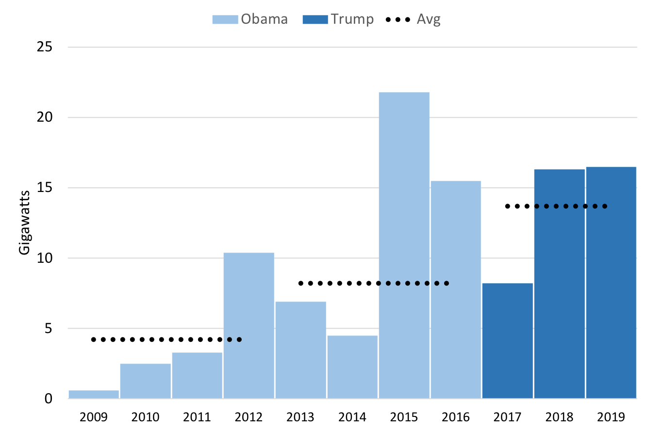 自2011年以來,經濟合作與發展組織(OECD)成員國的燃煤發電產能一直在下降。2019年,已退役的煤電產能中近一半位于美國,年退役量達到歷史記錄排名第二。在歐盟,退役產能規模歷史排名第四。在特朗普任期(2017-2019年)中,美國退役的燃煤電廠與奧巴馬任期(2009-2016年)相比增加了67%。在奧巴馬任職期間,平均每年退役煤電8.2吉瓦,而在特朗普任職期間,平均每年退役13.7吉瓦(見下圖)。