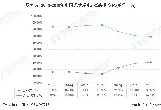 另從行業結構看,不同于光伏電站,分布式光伏發電是指在用戶所在場地或附近建設運行,以用戶側自發自用為主、多余電量上網且在配電網系統平衡調節為特征的光伏發電設施。近年來,國家對分布式光伏發電系統一直采取積極鼓勵的態度,并出臺了一系列扶持措施。2016年底出臺的《電力發展“十三五”規劃》對分布式光伏設定了超常規發展目標:“2020年,太陽能發電裝機達到1.1億千瓦以上,分布式光伏6000萬千瓦以上”。隨著各地分布式光伏發電建設的推進。我國光伏發電市場結構發生改變,尤其是2016年以來,我國分布式光伏市場份額已經由13.3%提升至2019年的30.33%。
