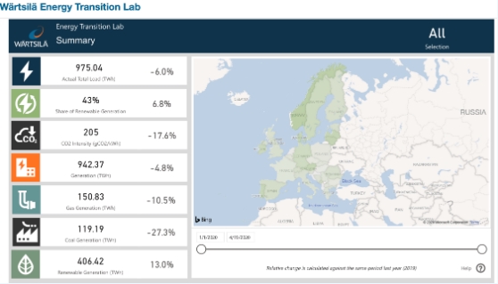 根據Wärtsilä Energy Transition Lab的實時數據,至2020年4月19日止,與去年同期相比,歐盟(包括英國)的發電量下降4.8%。其中,煤電下降27.3%,燃氣發電下降10.5%;但可再生能源發電量逆勢上揚13.0%,達到406.42TWh。可再生能源發電占歐盟發總電量的43%,比去年同期增加6.8個百分點。由于可再生能源比例增加,歐盟的發電碳強度下降17.6%,為205克/千瓦時。