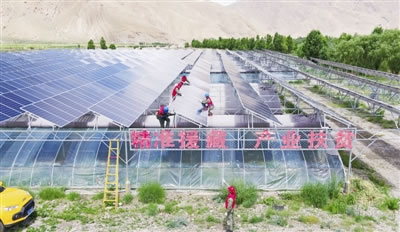 7月15日,在西藏山南市瓊結縣拉玉鄉,國網安徽省電力有限公司和國網湖北襄陽供電公司援藏幫扶人員對白那村“農光互補”發電設備進行檢修維護,助力高原農民脫貧致富。