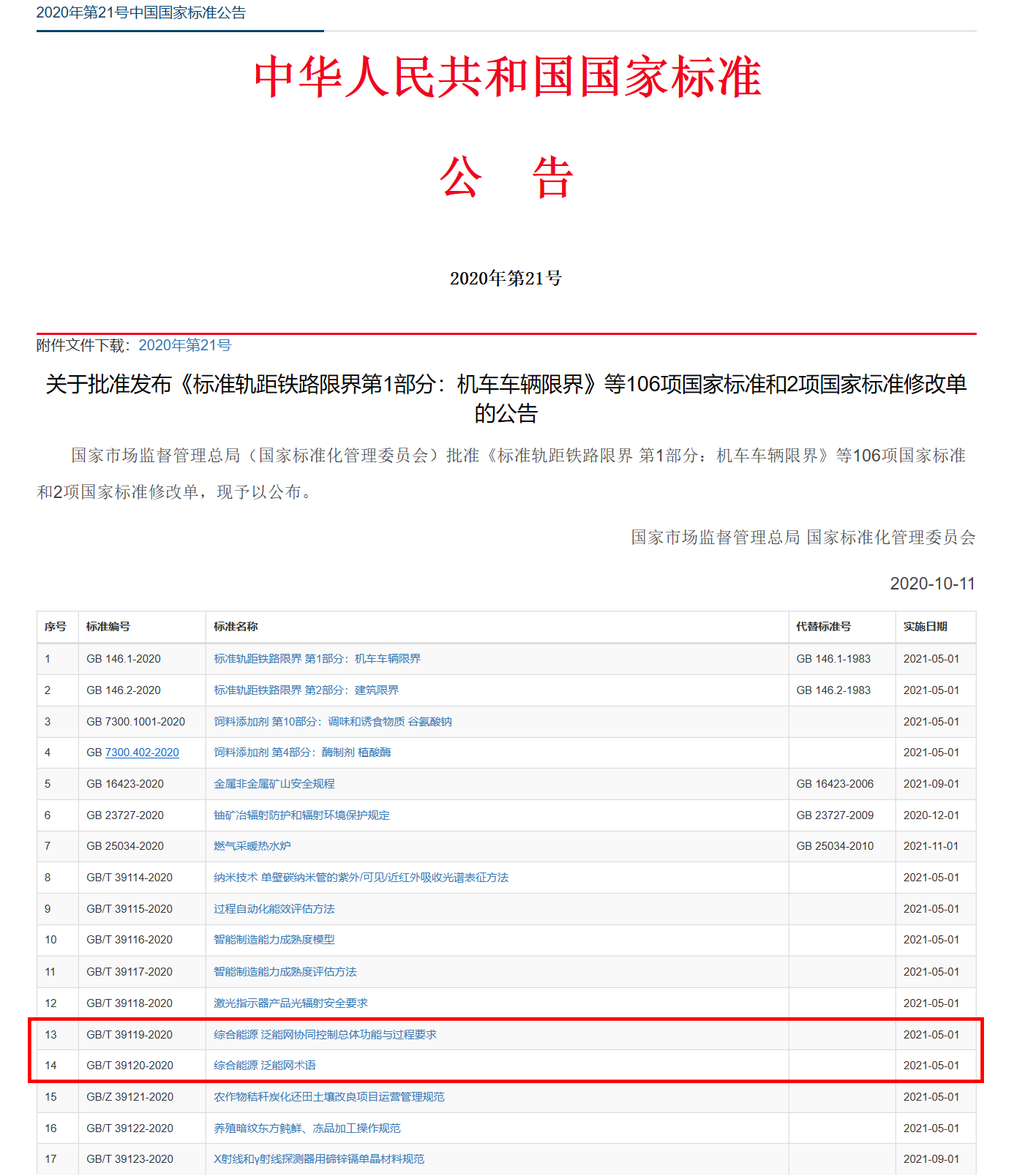 10月11日,由中國標準化研究院、新奧集團股份有限公司、新奧數能科技有限公司、華北電力大學能源互聯網研究中心等共同編制的《綜合能源 泛能網術語》和《綜合能源 泛能網協同控制總體功能與過程要求》正式發布。