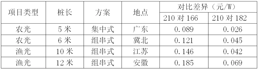 210產品的550W、600W以及660W,都是為大型地面電站設計的產品,目前進入量產的型號是550W。我們搜集了河北能源工程設計院和山東電力工程咨詢院兩家單位對于此款型號在不同緯度項目的系統造價差異對比結果,如下表: