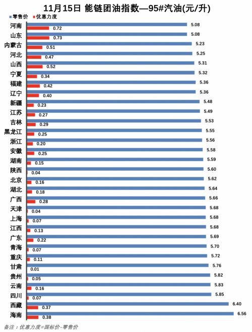 在95#汽油方面,山東和河南零售價最低,均為5.08元/升,海南零售價最高,達6.56元/升。優惠力度方面,山東優惠力度最大,達到0.73元/升,而甘肅則最低,僅為0.01元/升。