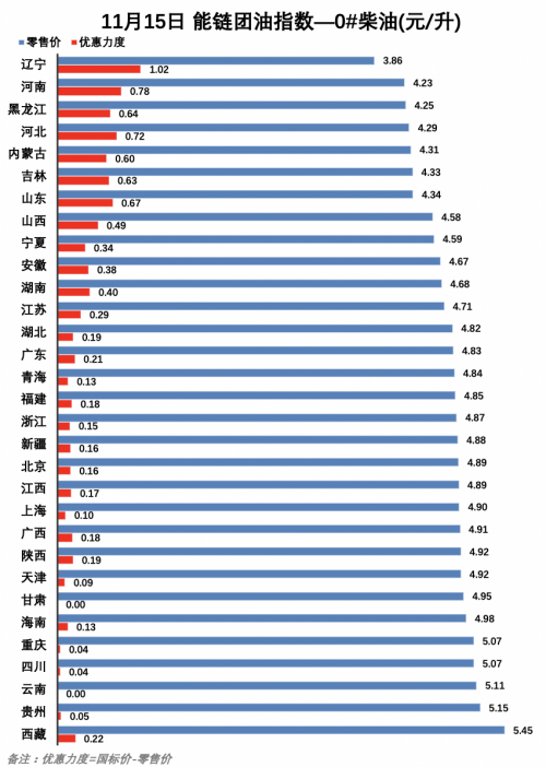 在0#柴油方面,遼寧零售價最低,為3.86元/升,西藏最高,為5.45元/升。優惠力度方面,遼寧優惠幅度最大,每升優惠1.02元,而甘肅和云南則沒有優惠。
