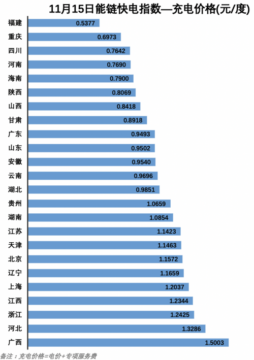 據11月15日能鏈快電指數顯示,福建充電價格最低,每度電僅為0.5377元,而廣西則最貴,每度電達到1.5003元。