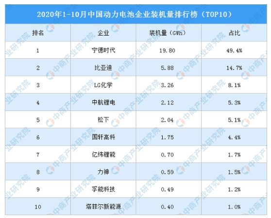2020年1-10月中國動力電池企業裝機量前十排名依次為寧德時代、比亞迪、LG化學、中航鋰電、松下、國軒高科、億緯鋰能、力神、孚能科技、塔菲爾新能源。