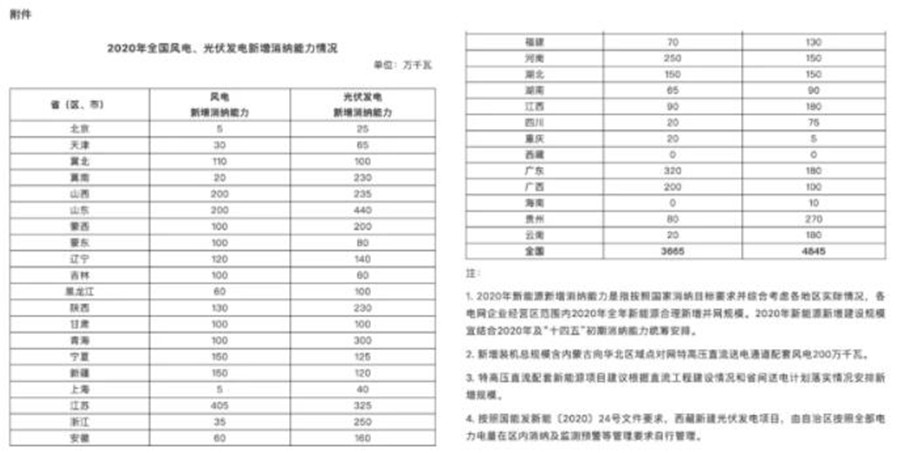2020年,電網給了風電36.65GW、光伏48.45GW的消納空間,合計85.1GW;