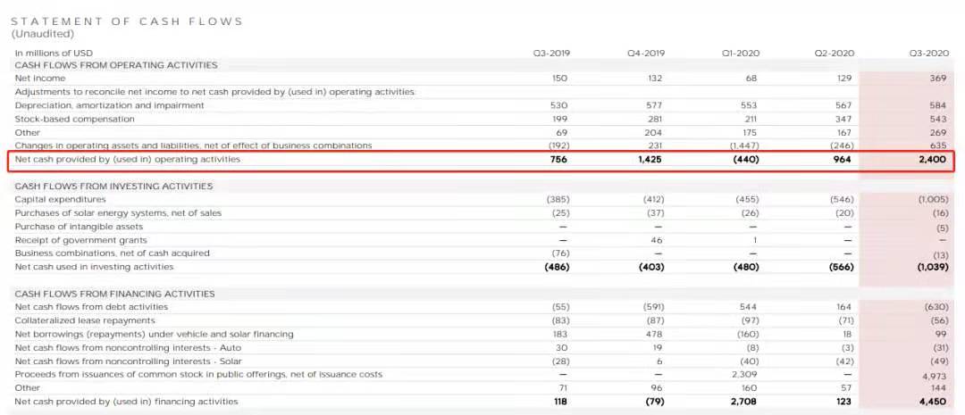 作為一家電動車企業,特斯拉經營活動產生的現金流為正(一季度中國市場疫情影響導致現金流異常),而且三季度相比去年翻了兩番,這也說明電動車業務確實能給特斯拉創造實實在在的現金流,并且電動車上的業務模式得到了相應的資本回報,而不是越賣越虧。
