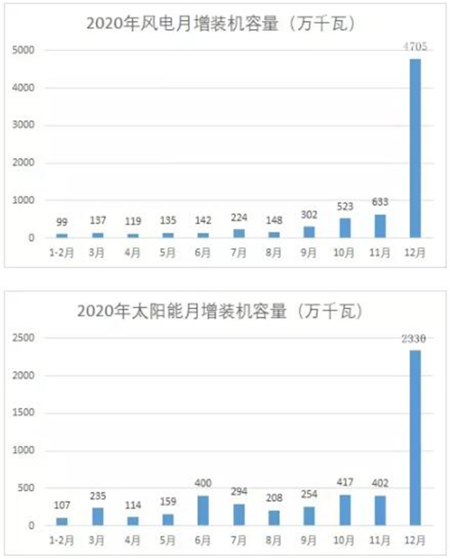2020年底的裝機容量之所以比前面月份高出這么多,主要原因是2021年陸上風電、光伏全面取消補貼,為確保項目收益,風光開發商竭盡全力要在2020年底并網。