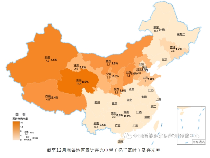 截至12月底各地區累計棄光電量(億千瓦時)及棄光率