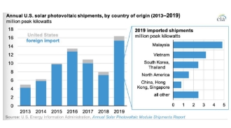 根據(jù)美國能源信息署(EIA)的報告,從2017-2019年,在“雙反”(反傾銷和反補(bǔ)貼)和關(guān)稅的庇護(hù)之下,美國組件進(jìn)口比例逐年提升,2019年美國組件出貨量約為13.28GW,但是進(jìn)口比例高達(dá)96.7%,其中最大的進(jìn)口國為馬來西亞。