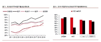 目前,中國光伏行業(yè)已經(jīng)完全具備上游高純度晶硅、中游高效太陽能電池片生產(chǎn)、到光伏電站的建設(shè)以及運(yùn)營的全產(chǎn)業(yè)鏈,并且具備完整的自主知識產(chǎn)權(quán)。2019年,中國在多晶硅、硅片、電池片、組件、逆變器環(huán)節(jié)產(chǎn)量的全球占比分別提升至67%/97%/79%/71/59%,換句話說,中國的光伏產(chǎn)品已經(jīng)遍布全球。