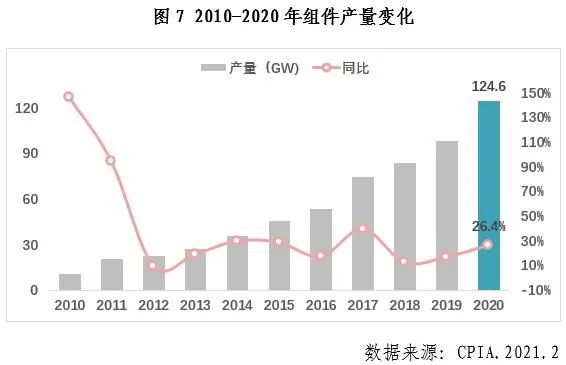 盡管受到年初的疫情沖擊、7-8月多晶硅料企業(yè)安全事故及新疆地區(qū)疫情導致的硅料供應緊張、以及7月開始由于光伏玻璃、EVA膠膜等供應緊張導致的原輔材料價格上漲等黑天鵝事件,我國光伏產(chǎn)業(yè)在國內(nèi)外市場的推動下,規(guī)模持續(xù)擴大。其中,多晶硅產(chǎn)量39.2萬噸,同比增長14.6%;硅片產(chǎn)量161.3GW,同比增長19.7%;電池片產(chǎn)量134.8GW,同比增長22.2%;組件產(chǎn)量124.6GW,同比增長26.4%。