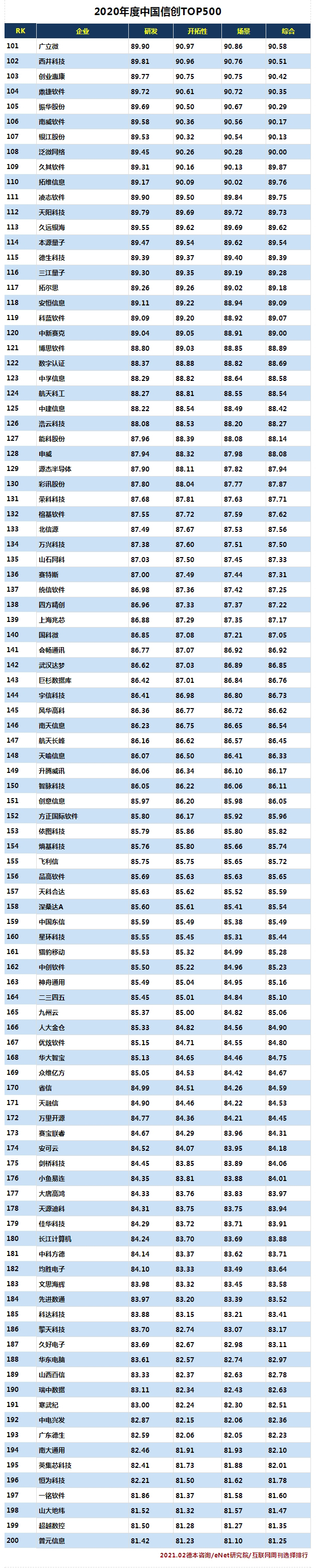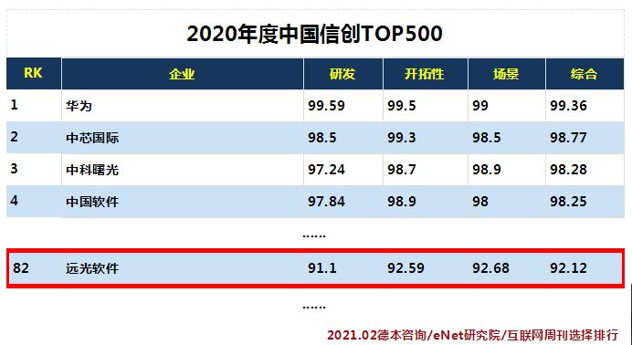 近日,中國科學院《互聯網周刊》、eNet研究院、德本咨詢聯合發布了“2020年度中國信創TOP500”,遠光軟件憑借在企業管理、能源互聯等信息化領域的多年實踐積累和技術創新,進入榜單前100名,排名第82位。
