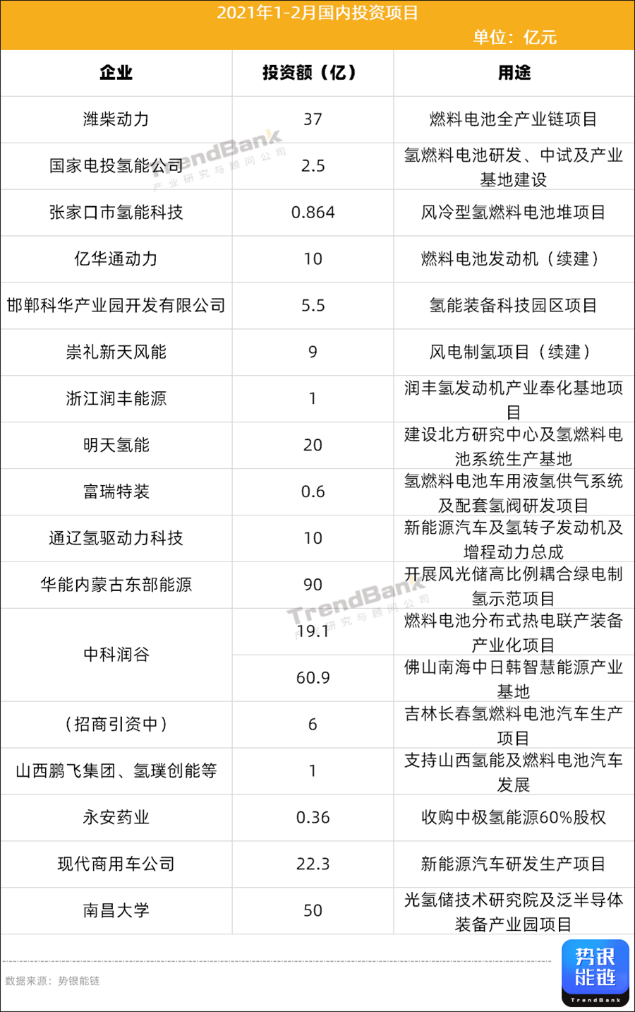 在國內,2021年氫電項目投資熱情不減。據勢銀能鏈不完全統計,2021年1月和2月,全國項目總投資/募資金額約346億元。