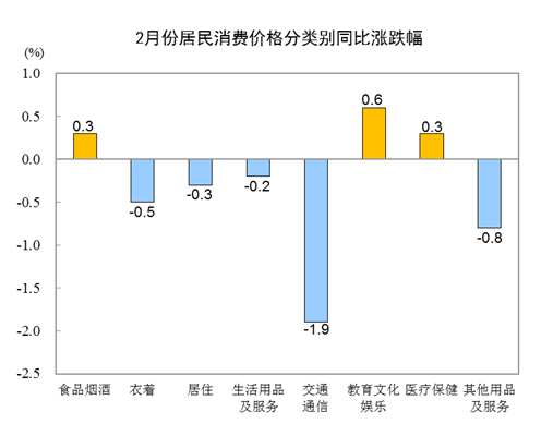 2月份,食品煙酒類價格同比上漲0.3%,影響CPI(居民消費價格指數)上漲約0.09個百分點。食品中,水產品價格上漲5.9%,影響CPI上漲約0.11個百分點;鮮菜價格上漲3.3%,影響CPI上漲約0.08個百分點;鮮果價格上漲3.1%,影響CPI上漲約0.06個百分點;蛋類價格上漲3.0%,影響CPI上漲約0.02個百分點;糧食價格上漲1.4%,影響CPI上漲約0.02個百分點;畜肉類價格下降7.3%,影響CPI下降約0.34個百分點,其中豬肉價格下降14.9%,影響CPI下降約0.39個百分點。