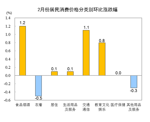 2月份,全國居民消費價格環比上漲0.6%。其中,城市上漲0.6%,農村上漲0.4%;食品價格上漲1.6%,非食品價格上漲0.4%;消費品價格上漲0.7%,服務價格上漲0.4%。