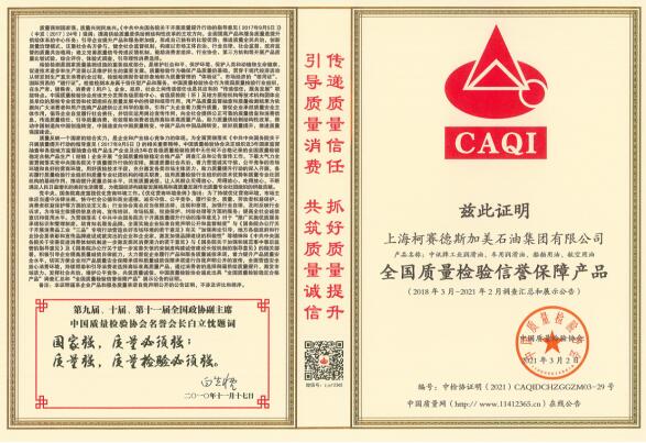 今年的3.15消費者權益保護日前夕,由國家市場監督管理總局主管的中國質量檢驗協會向上海柯賽德斯加美石油集團有限公司發出證書,證明該集團旗下四大系列產品(中訊牌工業潤滑油、車用潤滑油、船舶用油、航空用油)為“全國質量檢驗信譽保障產品”,這是中國質量檢驗協會連續3年(2018年3月-2021年2月)的調查匯總和展示公告。與此同時,中國質量網根據管理要求,并進行了同步在線公告,社會各界可根據“中檢協證明”編號,進行查詢和核實真偽。