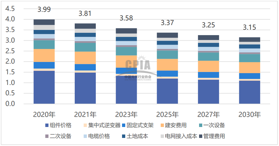 據CPIA預計,2021年,隨著產業鏈各環節新建產能的逐步釋放,組件價格回歸合理水平,光伏系統初始全投資成本可下降至3.81元/W,到2030年,我國光伏系統初始投資成本將會降至3.15元/W。