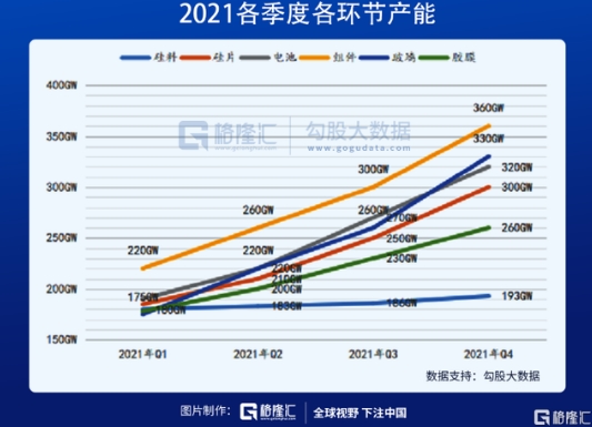 去年以隆基為首的硅片、組件環節,以通威為首的電池片環節,以信義光能為首的光伏玻璃,以福斯特為首的光伏膠膜拼命擴產,2021年光伏各環節(除硅料外)產能就有260-360GW;與之相反的硅料環節擴產就較為謹慎,2021年有效產能僅能支持193GW。