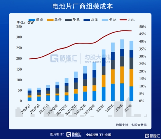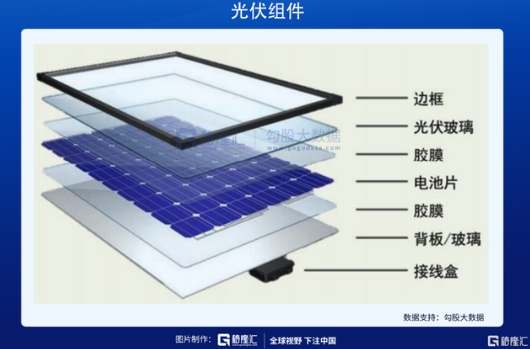 電池片生產完成后和支架、光伏玻璃、光伏膠膜等材料,組裝成組件;組件環節的玩家有隆基股份、晶科能源、晶澳科技等企業。