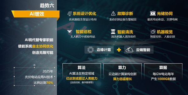 受益于人工智能及物聯(lián)網(wǎng)技術(shù),通過集成海量的專家經(jīng)驗(yàn)和不斷的自學(xué)習(xí),讓算法、算力、算據(jù)在計(jì)算中發(fā)揮最大作用,AI將在很大程度上代替運(yùn)維專家進(jìn)行診斷決策。通過智能跟蹤算法,讓組件、支架、逆變器協(xié)同運(yùn)行,找到最佳角度,釋放最大潛力。智能IV診斷,精準(zhǔn)定位故障,將運(yùn)維工作量從“月”降低到“分鐘”。無人機(jī)空中巡檢電站、清洗機(jī)器人清洗組件、智能安防和人臉識別等技術(shù),使光伏電站不斷完善系統(tǒng)設(shè)計(jì)優(yōu)化、故障診斷、光儲(chǔ)協(xié)同、智能巡檢、智能清洗、機(jī)器視覺,全面提升發(fā)電效率和重構(gòu)運(yùn)維體驗(yàn)。從而助力電站生產(chǎn)力和安全性提升。預(yù)計(jì)到2025年,光伏電站應(yīng)用AI技術(shù)比例達(dá)到70%。