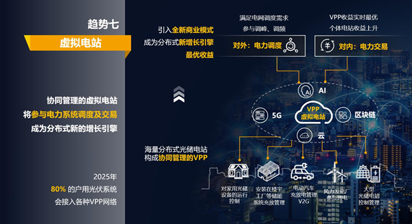 5G、區(qū)塊鏈、云服務(wù)等ICT技術(shù)的大規(guī)模應(yīng)用于分布式電站,組成協(xié)同管理的虛擬電站參與到電力系統(tǒng)的調(diào)度、交易與輔助服務(wù)中。未來5年,虛擬電站技術(shù)的發(fā)展會(huì)在分布式光伏場景中衍生出新的商業(yè)模式,以及新的市場參與者,成為分布式新的增長引擎。預(yù)計(jì)2025年,80%的戶用光伏系統(tǒng)會(huì)接入各種VPP網(wǎng)絡(luò)。