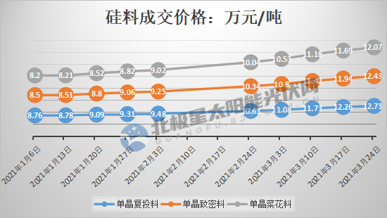 2021年產(chǎn)業(yè)鏈漲價(jià)大戲持續(xù)更新,根據(jù)硅業(yè)分會(huì)的數(shù)據(jù),本周復(fù)投料、單晶致密料、單晶菜花料成交價(jià)漲幅區(qū)間在4%-5%,從成交價(jià)格來看,單晶復(fù)投料最高價(jià)格達(dá)到13萬元/噸,均價(jià)在12.73萬元/噸,單晶致密料均價(jià)12.43萬元/噸,菜花料均價(jià)12.07萬元/噸。