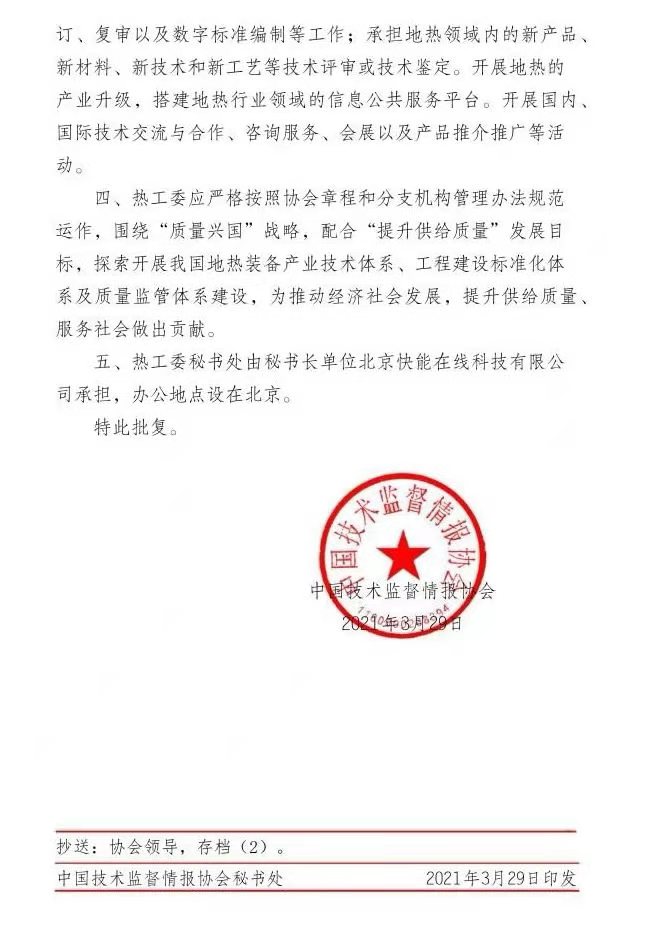 2021年3月29日,中國技術監督情報協會地熱產業工作委員會(以下簡稱中國地熱產業工作委)在京正式成立,中國地熱產業工作委辦公地點設在北京,秘書處設在北京快能在線科技有限公司。