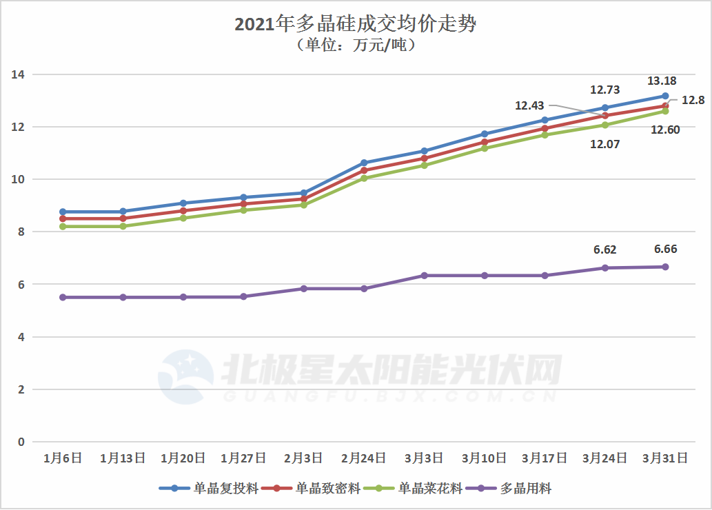 硅業分會發布的多晶硅最新價格顯示,本周多晶硅價格繼續維持上漲走勢。本周國內單晶復投料價格區間在12.5-13.5萬元/噸,成交均價為13.18萬元/噸,周環比上漲3.53%;單晶致密料價格區間在12.3 -13.3萬元/噸,成交均價為12.80萬元/噸,周環比上漲2.98%。