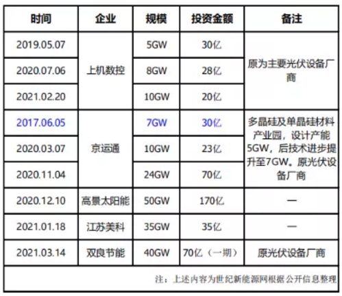 縱觀近幾年光伏行業(yè),擴(kuò)產(chǎn)兇猛。如三一集團(tuán)一樣跨界進(jìn)入硅片行業(yè)的企業(yè)并不少。據(jù)世紀(jì)新能源網(wǎng)不完全統(tǒng)計(jì),近兩年“跨界”或者突入、發(fā)力硅片板塊的企業(yè)并不少,較具代表性的主要為五家,分別為上機(jī)數(shù)控、京運(yùn)通、雙良節(jié)能、高晶太陽(yáng)能、美科,僅此五家,所涉及的硅片產(chǎn)能超180GW,總投超440億。
