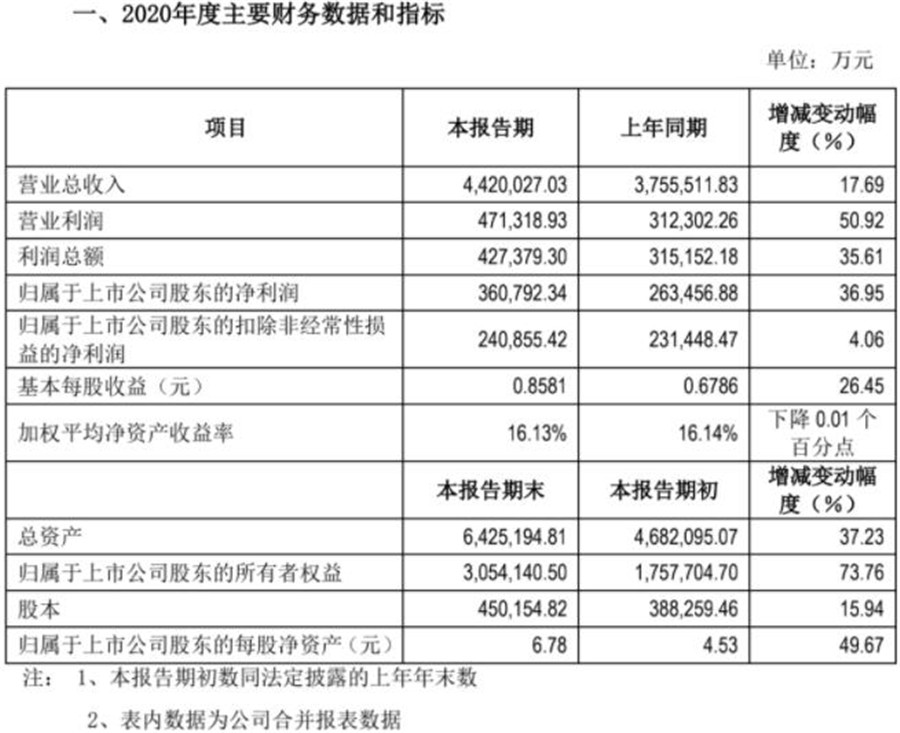 其中,經初步核算,2020年度通威股份實現營業收入442.00億元,同比增長 17.69%;實現歸屬于上市公司股東的凈利潤36.08億元,同比增長36.95%;扣除非經常性損益后歸屬于上市公司股東的凈利潤為24.09億元,同比增長4.06%;基本每股收益0.8581元,同比增長26.45%。