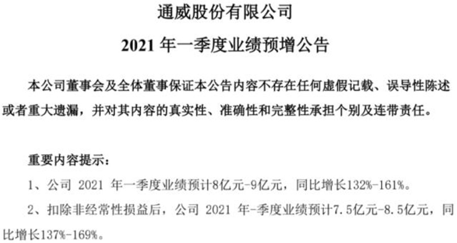 日前,通威股份有限公司(下稱“通威股份”)發布2020年度業績快報公告及20201年一季度業績預增公告。