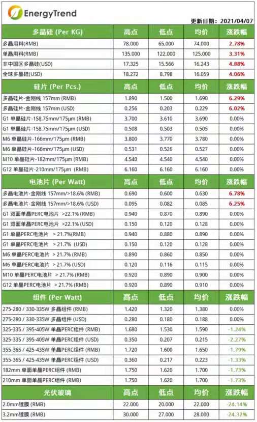 其中: 多晶硅料高點78元/kg、低點65元元/kg、均價74元/kg,漲幅2.78%。