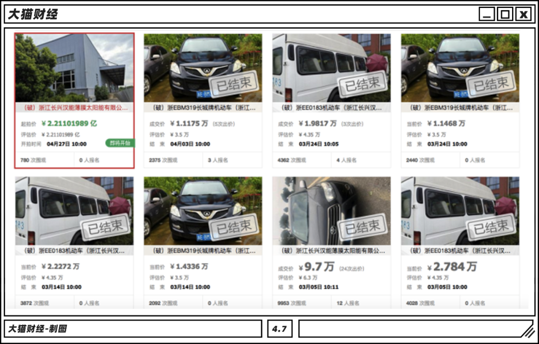 拍賣的資產各式各樣,幾輛二手車標價一兩萬,但沒人買,房產2.21億起拍,一點也不打折,看來還是房子值錢。