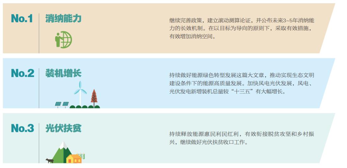 持續做好能源綠色轉型發展這篇大文章,推動實現生態文明 建設條件下的能源高質量發展。加快風電光伏發展,風電、 光伏發電新增裝機總量較“十三五”有大幅增長。 持續釋放能源惠民利民紅利,有效銜接脫貧攻堅和鄉村振 興,繼續做好光伏扶貧收口工作。