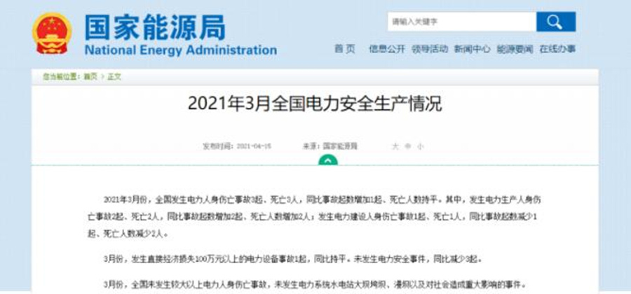 3月份,全國未發(fā)生較大以上電力人身傷亡事故,未發(fā)生電力系統(tǒng)水電站大壩垮壩、漫壩以及對(duì)社會(huì)造成重大影響的事件。