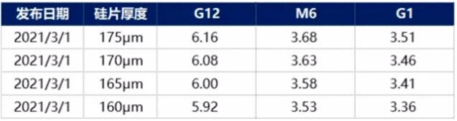 2月23日,中環發布《技術創新和產品規格創新新降低硅料程本倡議書》,表示愿意配合下游客戶逐步推動170μm、165μm和160μm厚度單晶硅片的應用。中環提出此倡議的出發點是多晶硅材料價格持續上漲,希望通過減薄硅片厚度緩解下游電池、組件客戶的成本壓力。隨后中環對160μm系列產品進行相關報價。