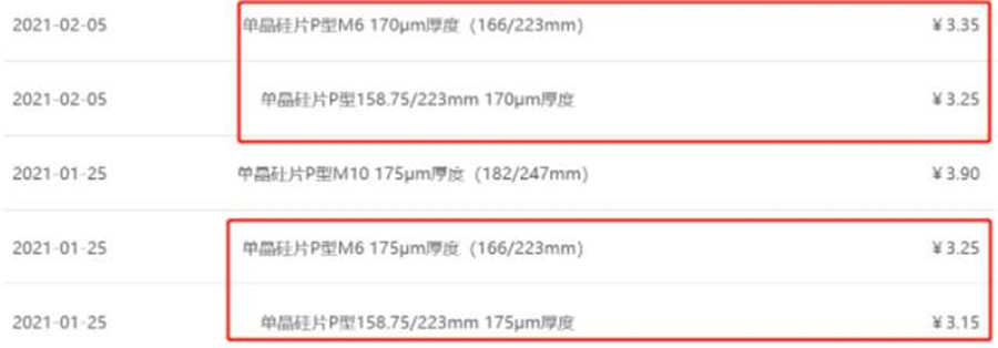 2021年4月15日,隆基股份公示單晶硅片價格。其中:G1、M6(170μm厚度)報價為3.90元/片、4.00元/片,M10(175μm)報價為4.86元/片。此價格與隆基股份在20天前3月25日公示的價格相比,M6、G1上漲0.25元/片,漲幅分別為6.7%、6.8%;M10上漲0.3元/片,漲幅為6.58%。