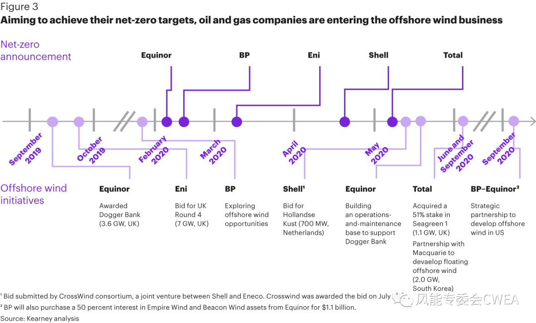 海上風電價值鏈上變得越來越擁擠,新的玩家越來越多。在傳統玩家追求激進的增長速度以保持領先地位的同時,更強勁的新進入者期待重塑海上風電格局。2020年全球各地越來越多國家和行業、企業確定了其凈零目標,這對石油和天然氣行業沖擊巨大,自Equinor開始,為了支持各自企業的凈零排放目標的實現,幾大石油和天然氣運營商也開始就過去幾年推出的幾項海上風電倡議進行溝通(見圖3)。