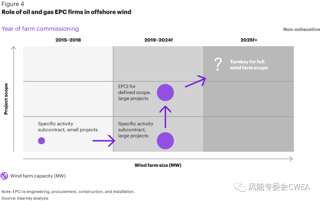 在項目開發方面,傳統的油氣服務商及EPC參與方正在利用其豐富的海上能力開始向海上風電多元化發展(見圖4)。傳統上,油氣EPC只是作為海上特定項目活動的分包商,很少參與海上風能項目,例如,它們只提供小型風電場基礎的安裝。但現在,這些EPC也參與到海上風電價值鏈中,對產業鏈進行重新定位,可提供更大更復雜的項目服務——從大型風電場的分包合同,到為特定項目提供工程、采購、建設和安裝的服務,轉身為EPCI角色。將來,一個EPC參與者的角色可能會演變為一攬子交付整個風電場,所謂的交鑰匙(turnkey)工程。目前為止,只在亞洲存在這樣的先例。