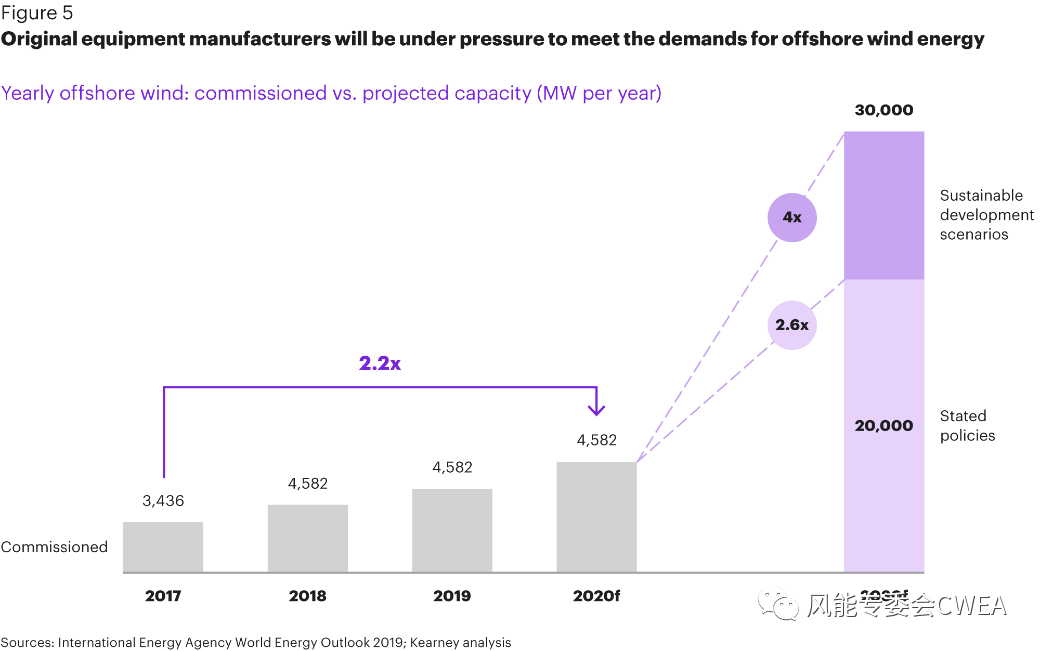 充分發揮海上風電的潛能,就像延伸價值鏈一樣,可能會帶來風機生產和物流的瓶頸。第一個問題是,全球風電整機制造商(OEMs)是否有能力擴大生產以滿足不斷發展的需求。在過去的幾年中,全球整機廠商海上風電裝機年新增裝機容量不到5GW,但到2030年,需求將增長到每年20至30GW(見圖5)。這和目前全球的整機商的制造能力和財務狀況還有一定的差距。同時,不斷增長的海上風電物流需求(如近海船舶,運輸和安裝船等),可能會導致相關船只的缺口,從而導致船只租用價格的上漲。