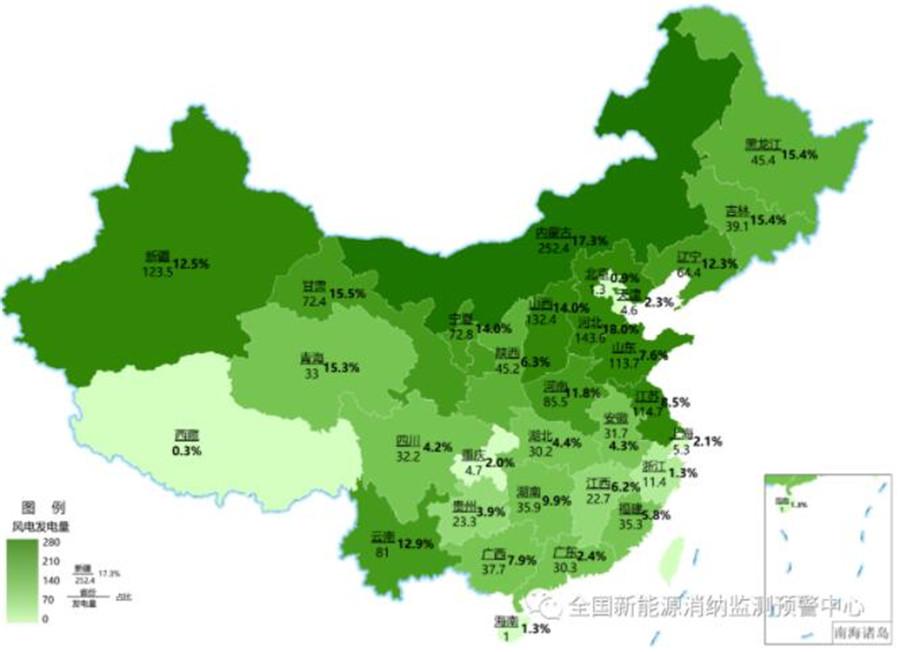 截至3月底各地區累計風電發電量(億千瓦時)及占本地區總發電量比重
