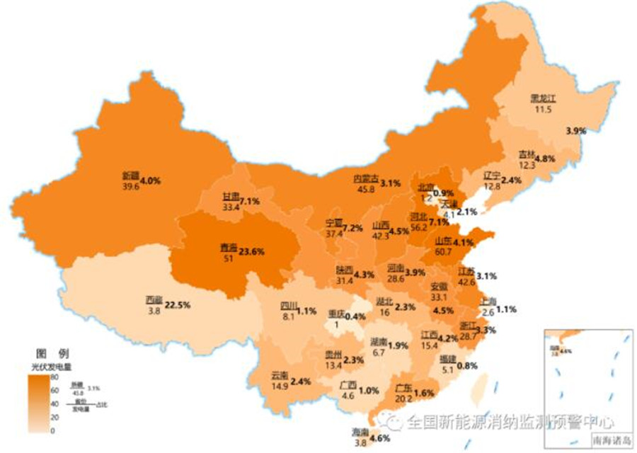 截至3月底各地區累計光伏發電量(億千瓦時)及占本地區總發電量比重