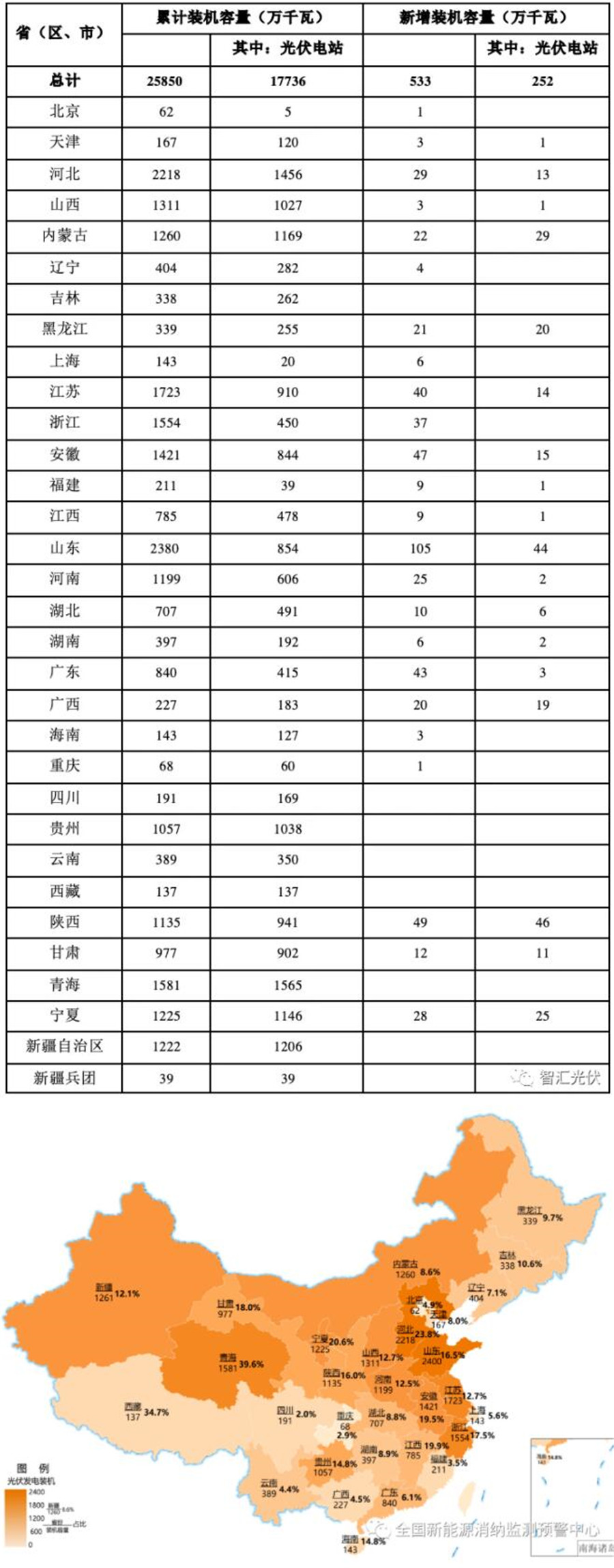 截至3月底,全國光伏并網裝機2.59億kW。全國各省新增、累計光伏裝機如下表所示。