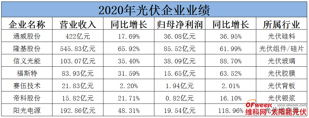 OFweek太陽(yáng)能光伏網(wǎng),根據(jù)2019年市場(chǎng)份額及2020年的動(dòng)態(tài)表現(xiàn),結(jié)合各企業(yè)年度報(bào)告進(jìn)行匯總。從上至下篩選出了光伏硅料、光伏硅片、光伏逆變器、光伏玻璃、光伏背板、光伏膠膜、光伏銀漿的龍頭企業(yè)。通過(guò)2020年的業(yè)績(jī)表現(xiàn),看看哪個(gè)環(huán)節(jié)更賺錢(qián)?