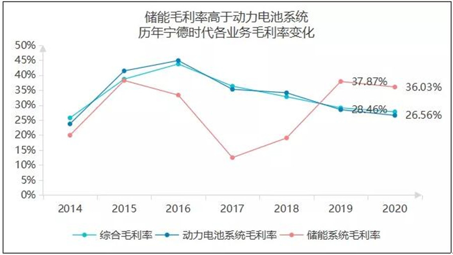 2019年和2020年,動力電池系統的毛利率為28.46%和26.56%,而儲能系統的毛利率分別為37.87%和36.03%。