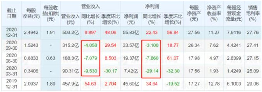 2020年受疫情影響,寧德時代前三季度的營業收入同比下滑明顯,凈利潤也處于同比負增長。
