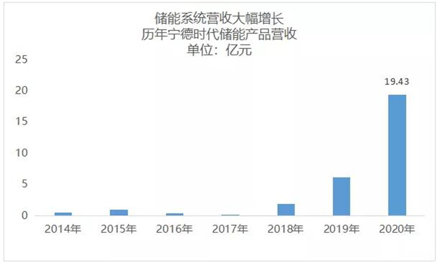 隨著前期儲能市場布局逐步落地,寧德時代去年全年實現儲能系統銷售收入為19.43億元,同比增長218.56%。